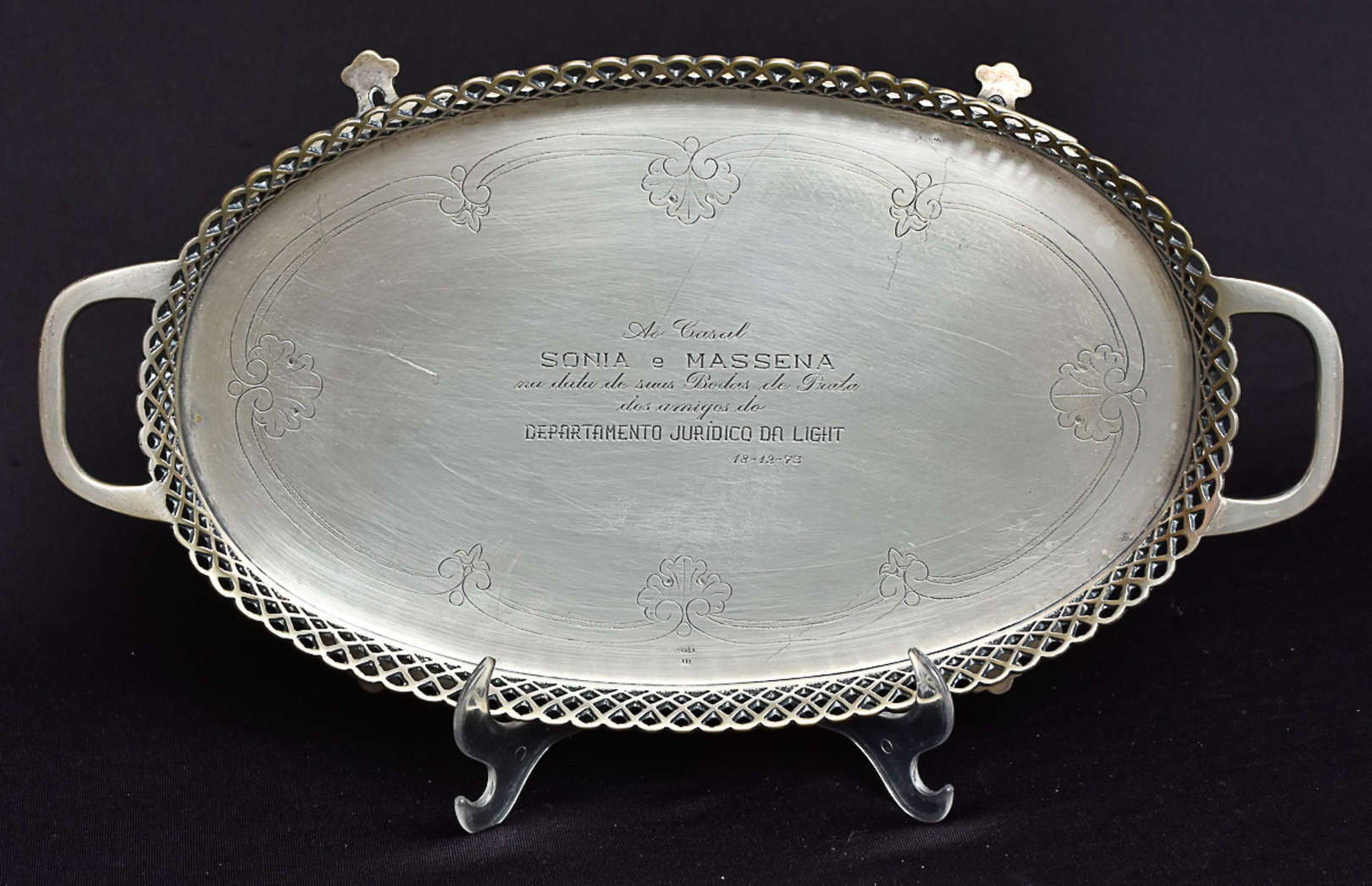 Porta confeitos em metal espessurado a prata, bandeja com borda recortada e ondulada; pega em haste retorcida altura ...