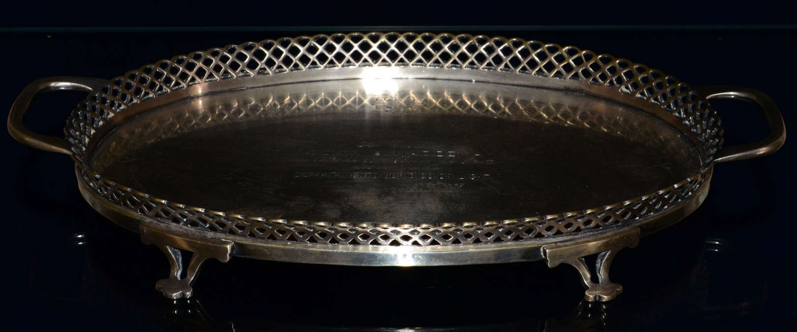 Salva sextavada em prata contrastada 800 mls, galeria vazada, decorações em baixo relevo, pés em garra. Peso aprox ...
