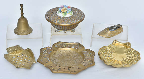 Lote composto de seis peças diversas em bronze, sendo caixa porta-jóias com tampo trabalhado e decoração floral (pega...