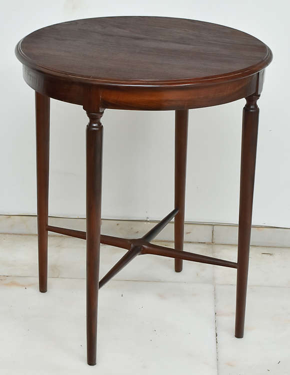 Mesinha estilo inglês em madeira nobre, com tampo circular em madeira e coberto por vidro, tendo a borda torneada e ...