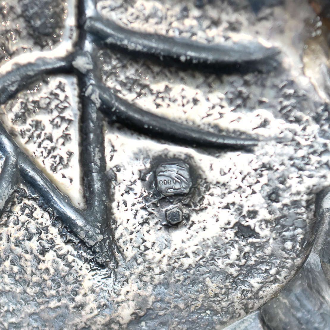 Salva sextavada em prata contrastada 800 mls, galeria vazada, decorações em baixo relevo, pés em garra. Peso aprox ...