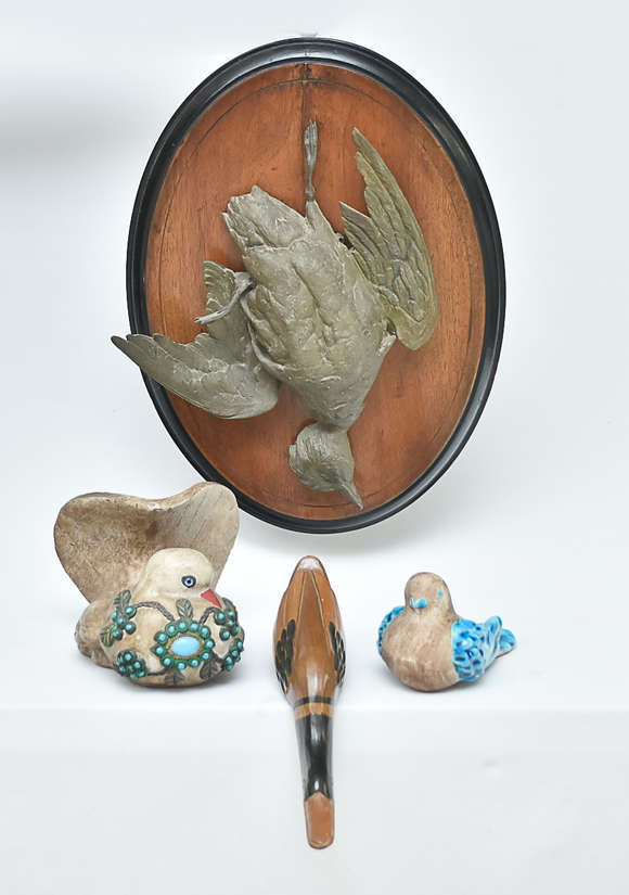 Diversas peças, sendo escultura em forma de ave em bronze sobre base ovalada em madeira nobre e borda torneada, medin...